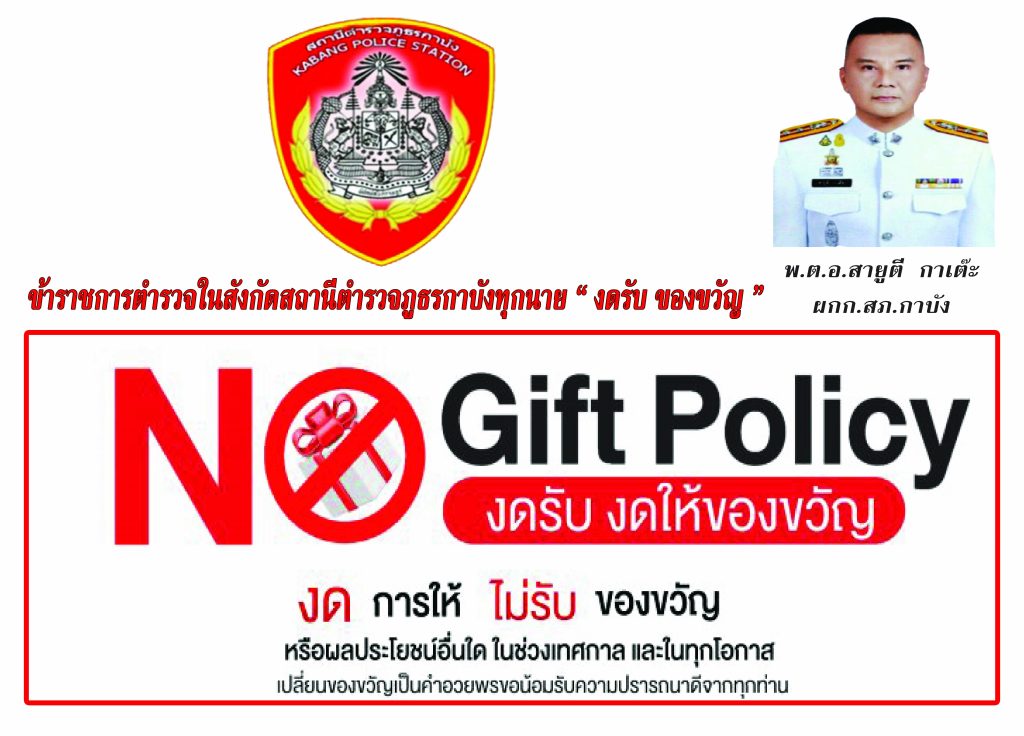 พ.ต.อ.สายูตี กาเต๊ะ ผกก.สภ.กาบัง ร่วมกับข้าราชการตำรวจ สภ.กาบัง ร่วมประกาศเจตนารมย์การปฏิบัติในการต่อต้านการรับสินบน (Anti-Bribery Policy) และการไม่รับของขวัญ ของกำนัล หรือประโยชน์อื่นใด (No Gift Policy) จากการปฏิบัติหน้าที่