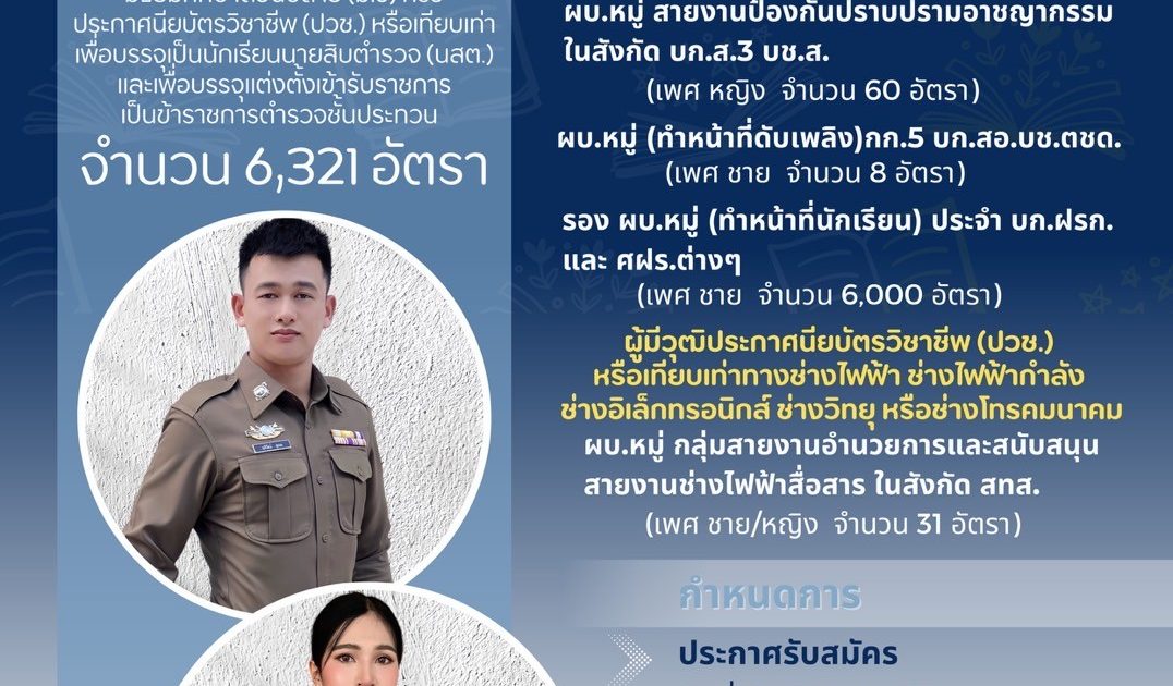สำนักงานตำรวจแห่งชาติเปิดรับสมัครและคัดเลือกบุคคลภายนอก เพื่อบรรจุและแต่งตั้งเป็นข้าราชการตำรวจชั้นประทวน จำนวน 6,321 อัตรา